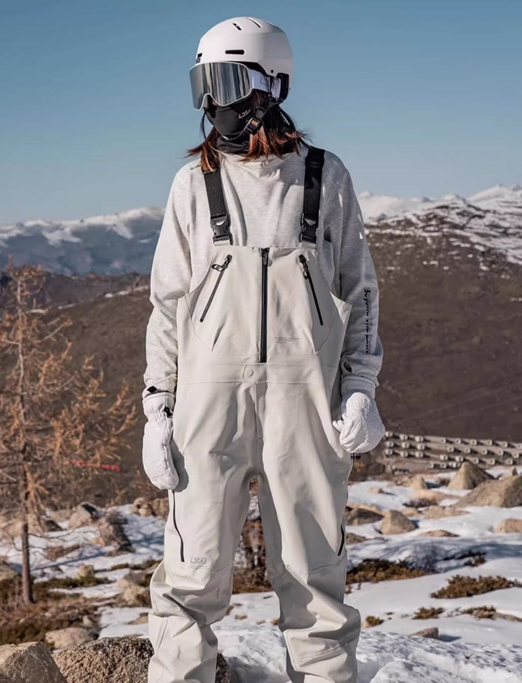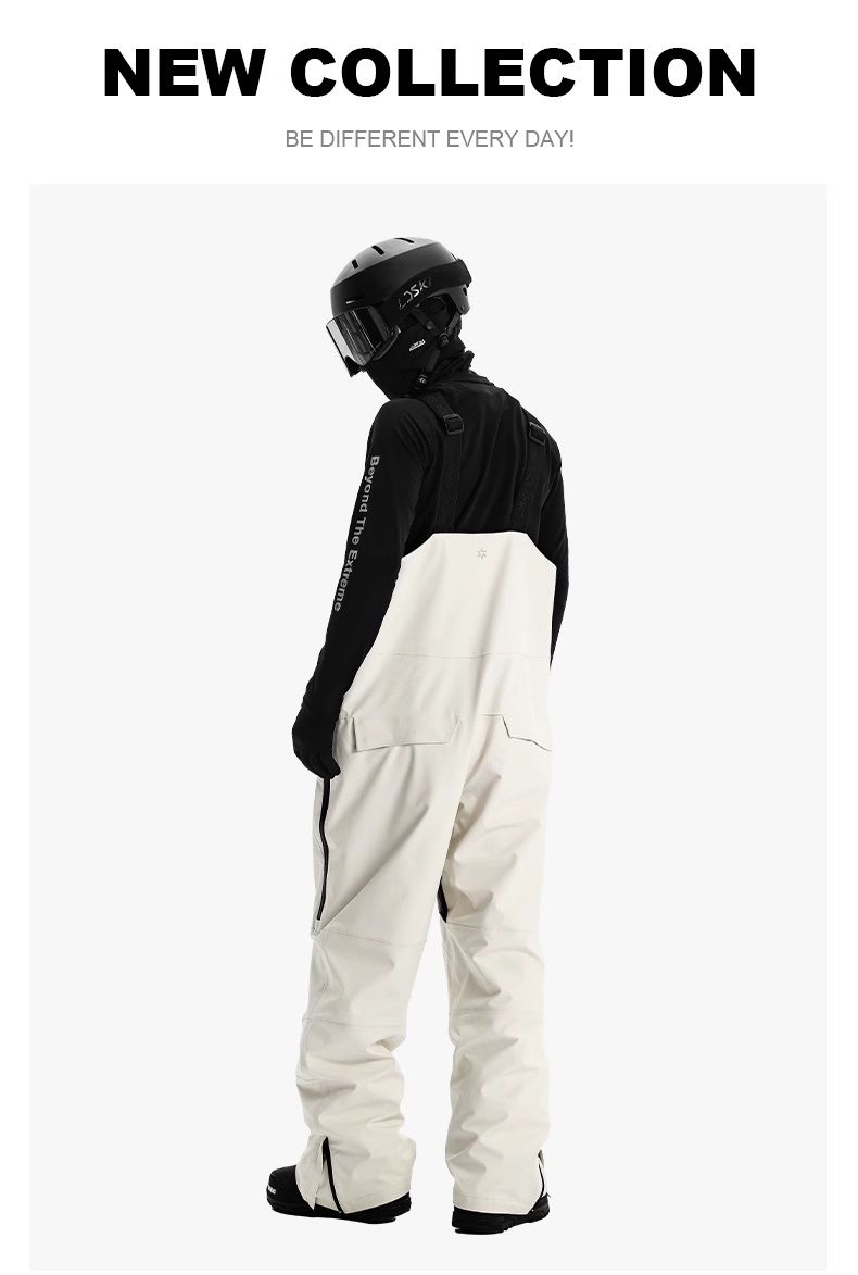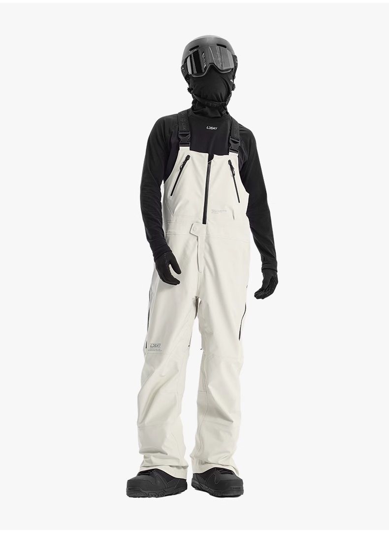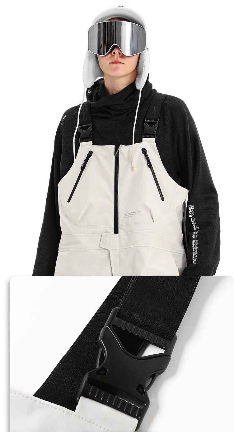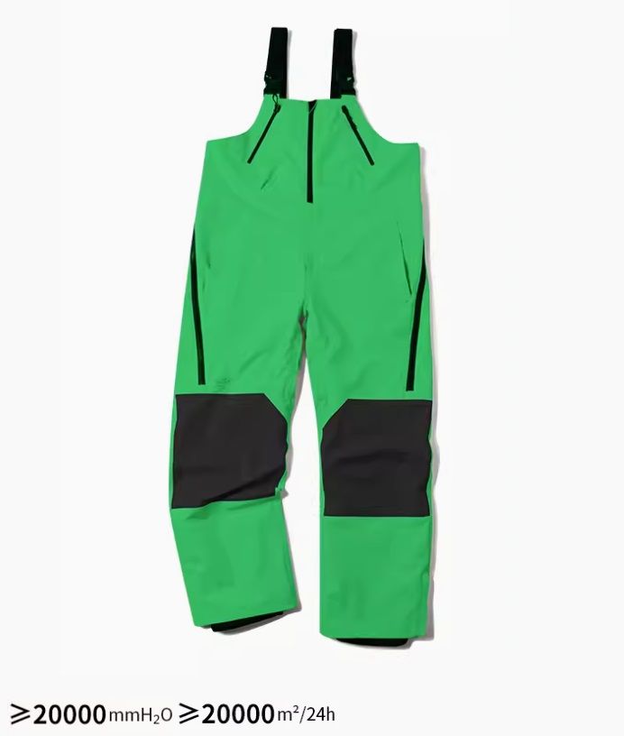 В штанах имеется 6 карманов, 2 сверху на груди, 2 по бокам, 2 сзади, все карманы с молниями. На шантанах имеются "юбки" которые заправляются в ботинки для защиты от снега, на штанинах имеются молнии позволяющие расширить нижнюю часть, в районе паха имеется молния для дополнительной вентиляции. На бедрах с двух сторон имеются молнии позволяющие расстегнуть штаны до колен. Лямки на спине идут крест на крест, что уменьшает вероятность спадания лямки с плеч.