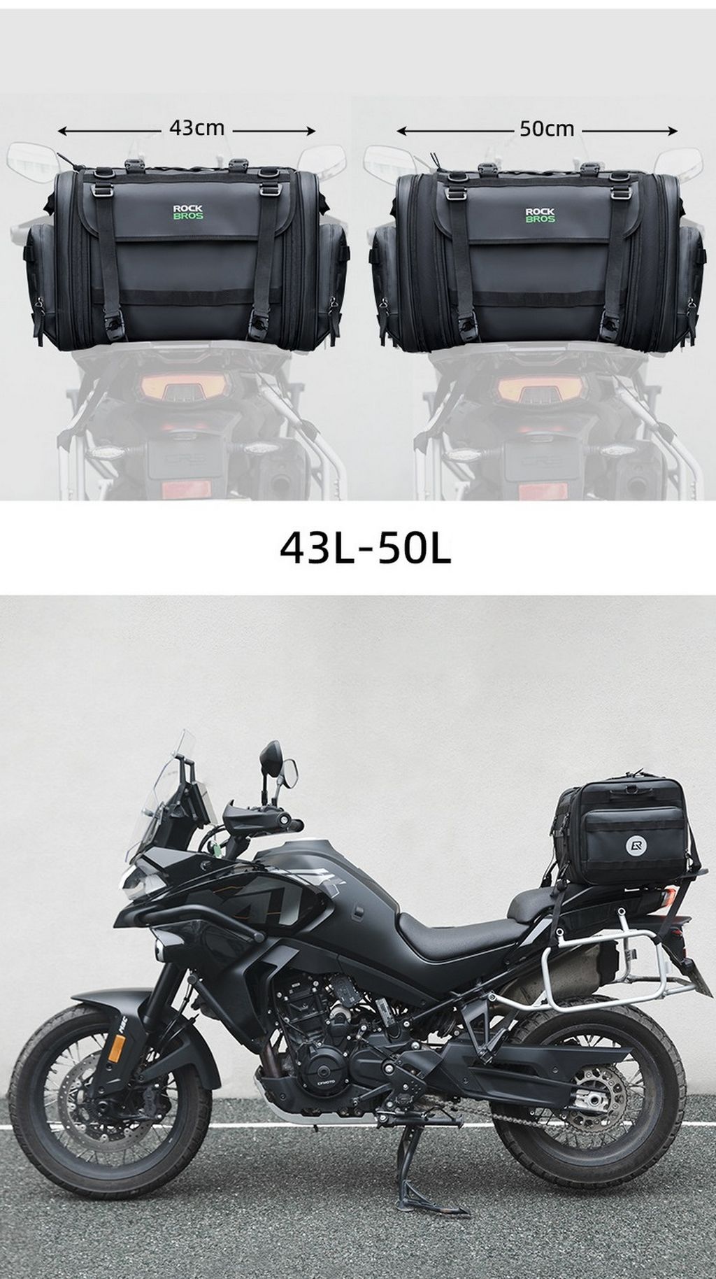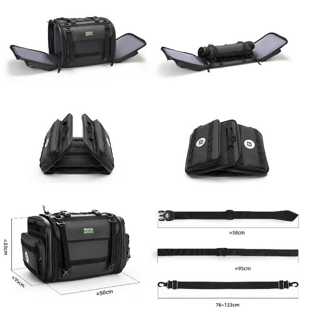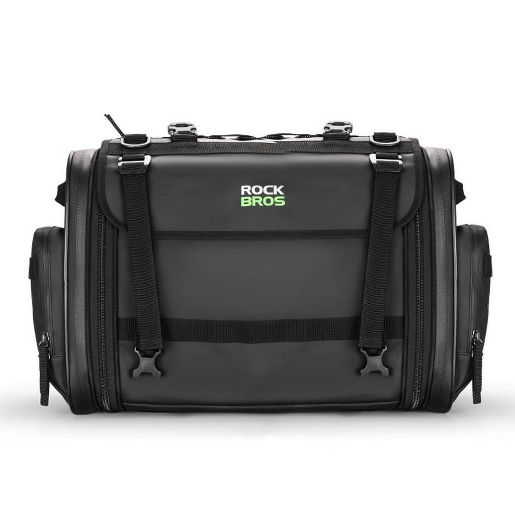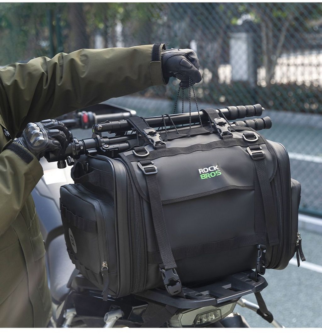 Сумка выполнена из водонепроницаемого материала PVC, предназначена для мото путешествия, имеет много карманов и резинки для фиксации снаряжения и стропы для удержания шлема . Регулируемый объем