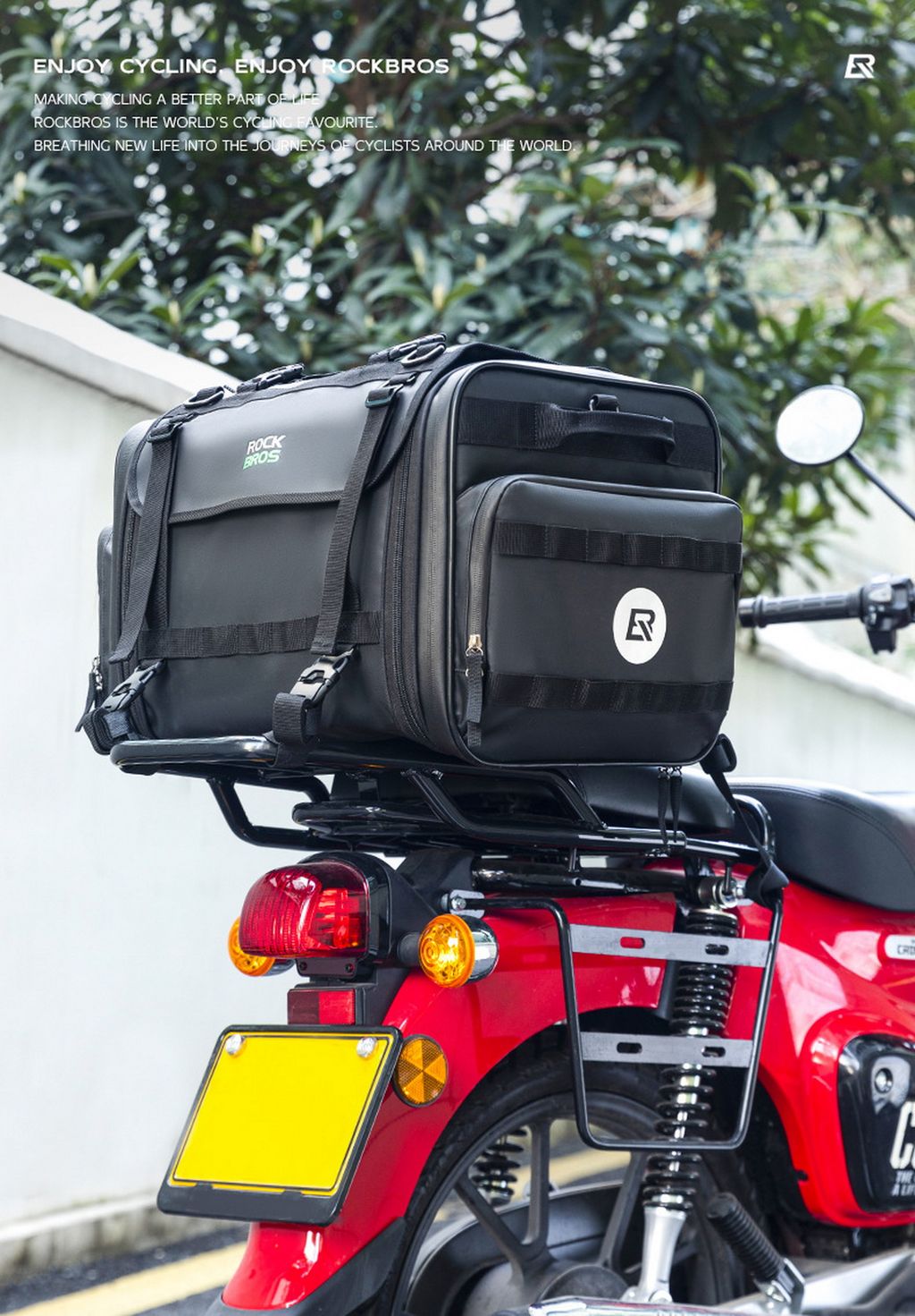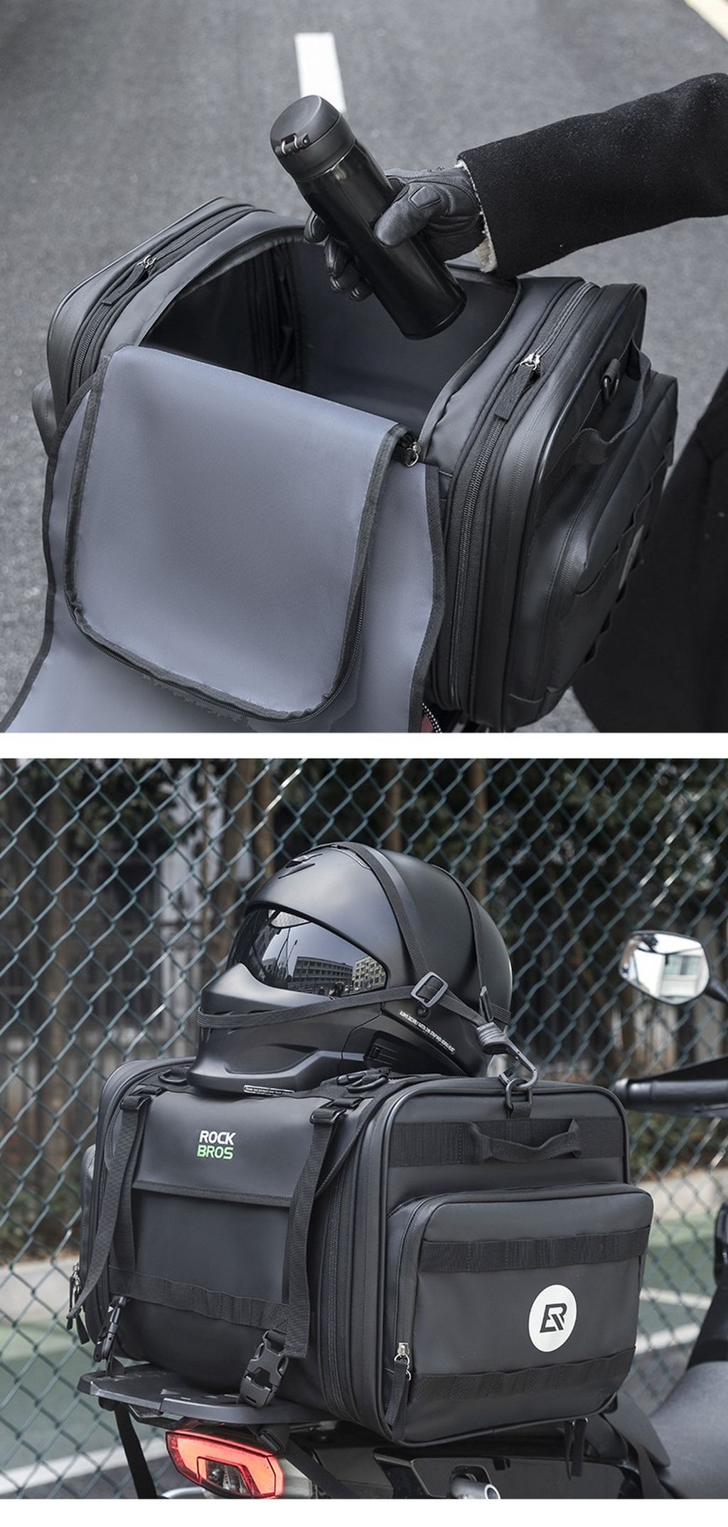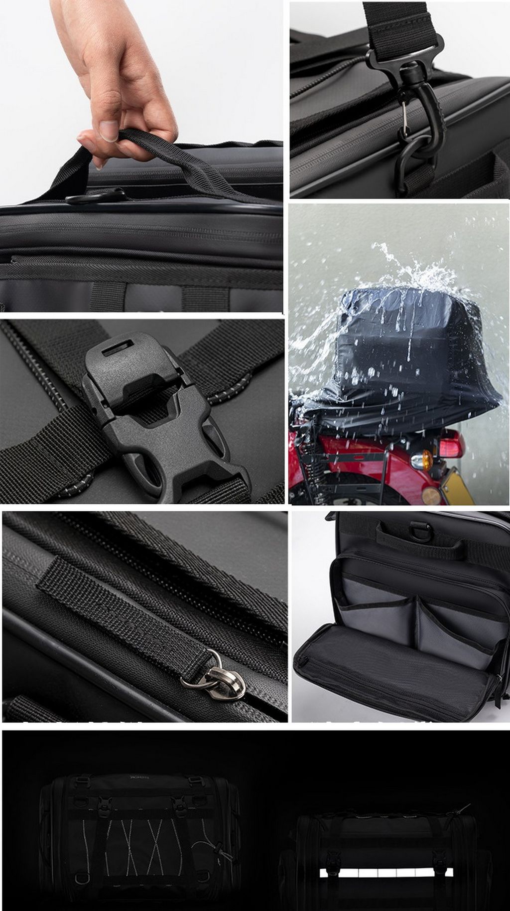 Сумка выполнена из водонепроницаемого материала PVC, предназначена для мото путешествия, имеет много карманов и резинки для фиксации снаряжения и стропы для удержания шлема . Регулируемый объем