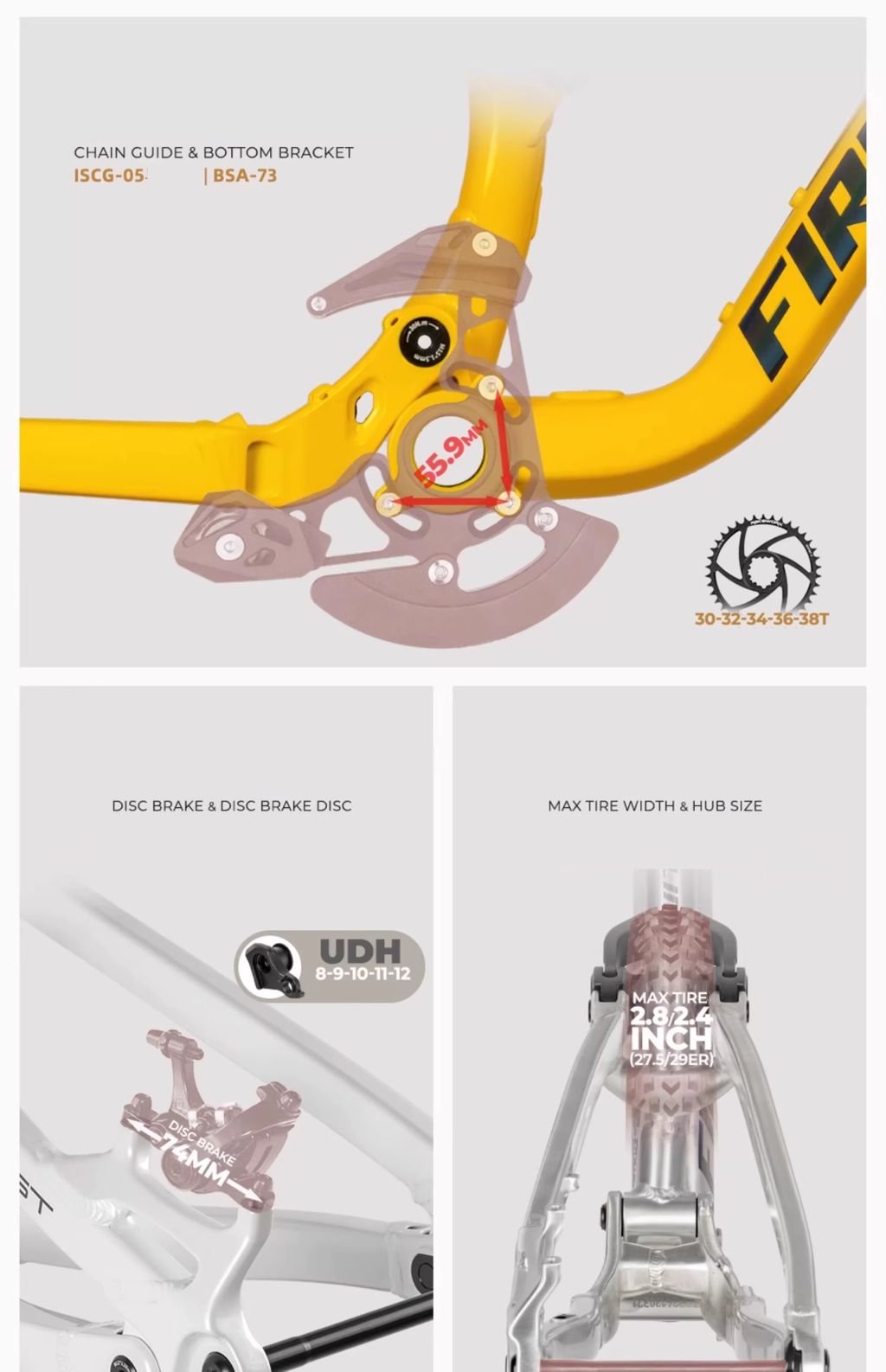 Назначение: All Mountain. Enduro Ход подвески: 150 мм Установка вилки с ходом:150-160 мм Каретка BSA73 Рулевая колонка: 44/55 в комплекте Задняя ось: 148 BOOST в комплекте Проводка тросов: Внутренняя Штырь: 30.9 мм Колеса: 27.5+/29ER Макс: резина: 2.5 Размер амортизатора : 210MM,22MM/32MM Подседельный хомут в комплект не входит.