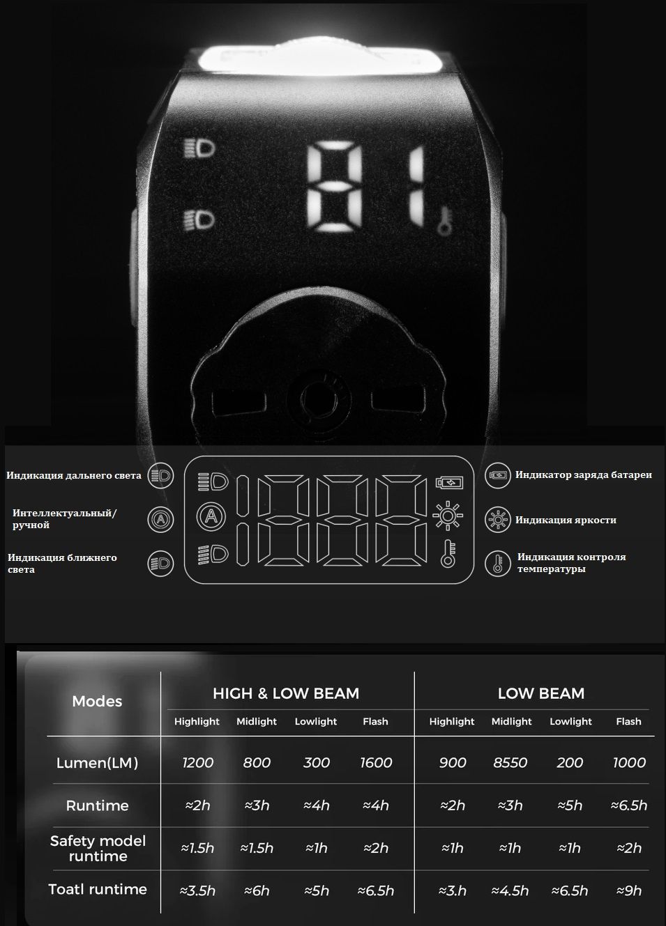 - Индикация заряда на мониторе