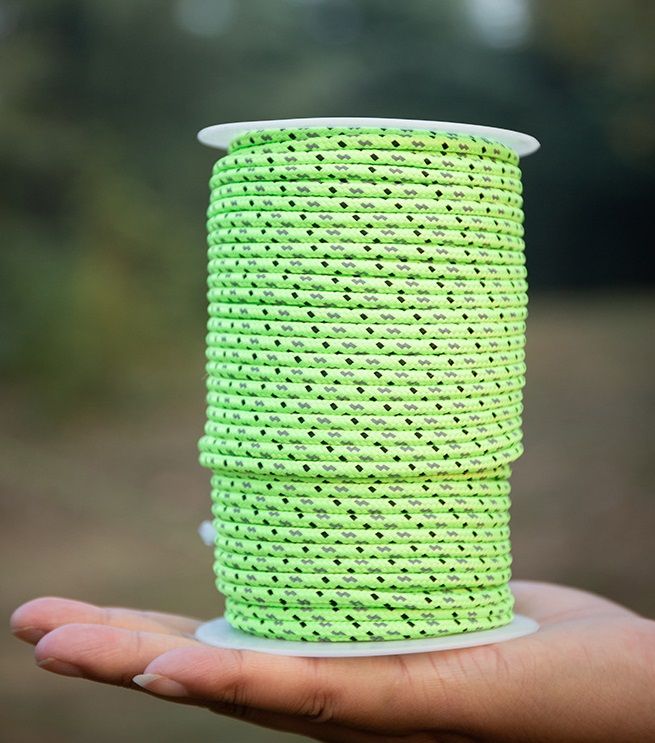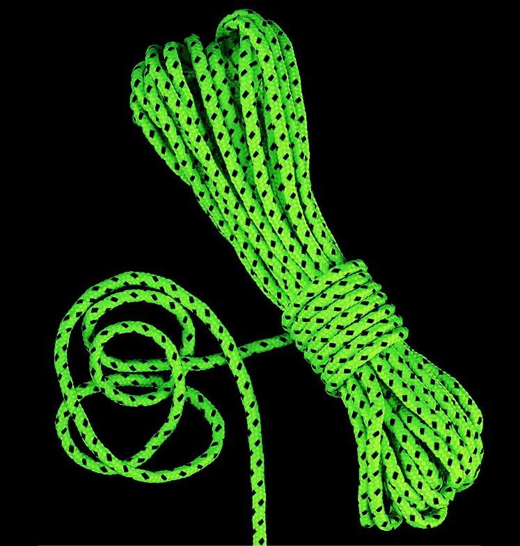 Моток 50 метров, диаметром 4 мм В веревку вплетена нить со светоотражающим элементом, делает веревку заметнее ночью.