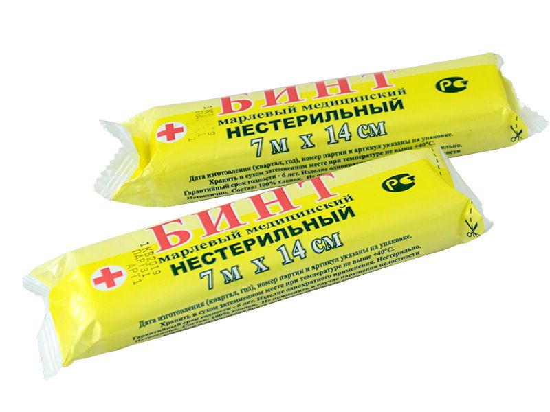 Бинт медицинский 7*14 из нетканого материала с неосыпающимися краями нестерильный, 30 г/м2, индивидуальная упаковка, Россия (ООО "Емельянъ Савостинъ. Ватная фабрика")