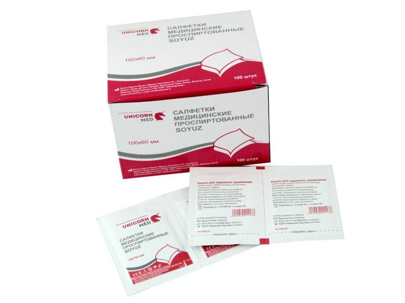 Салфетка Soyuz проспиртованная 100*60 мм медицинская (70% раствор этилового спирта), 100 шт/упаковка, Китай (Baoying County Fukang Medical Appliance) СП11-13