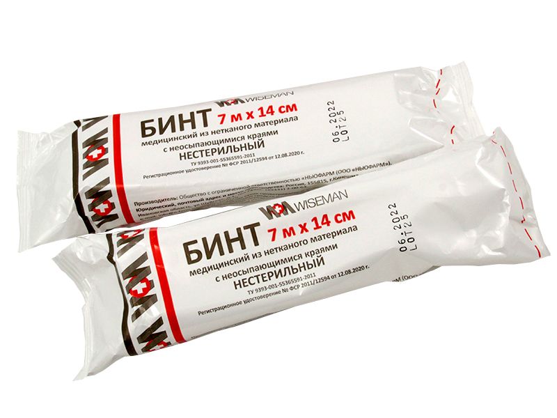 Бинт медицинский 7*14 "Wiseman" из нетканого материала с неосыпающимися краями нестерильный, индивидуальная упаковка, Россия (ООО "Ньюфарм")