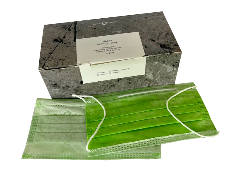 Маска медицинская "Dental Formula" из нетканного материала, одноразовая 3-х слойная на резинке, цвет зеленый, 50 шт/упаковка, Россия (ООО "Маска")