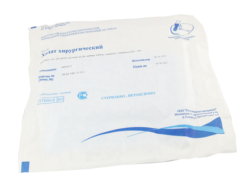 Халат хирургический длина 140 см стерильный, спанбонд плотность 25 г/м2, рукав на манжете (голубой), размер 52-54, Россия (Гекса-нетканые материалы)
