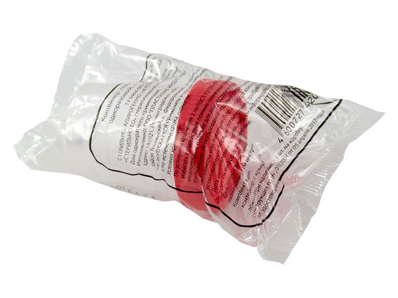 Контейнер для биопроб 120 мл одноразовый медицинский полимерный (полипропилен) стерильный, винтовая крышка, градуировка и окошко для записи, 250 штук/упаковка, Россия (ООО "Пластилаб") КОП-201