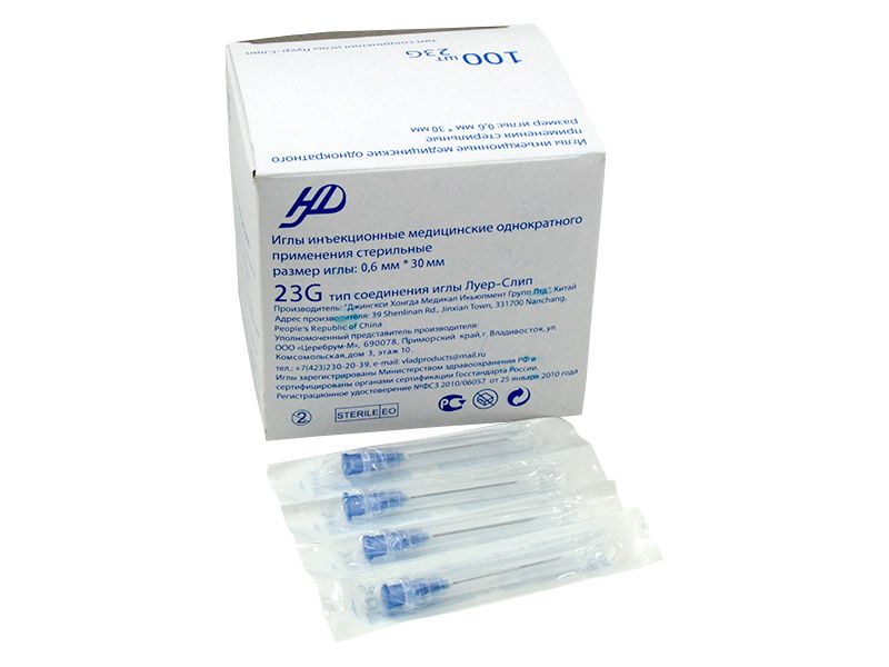 Игла инъекционная 23G (0,6*30 мм), медицинская, однократного применения, стерильная, тип крепления "Луер", 100 шт/упаковка, Китай (Jiangxi Hongda Medical Equipment Group Ltd)