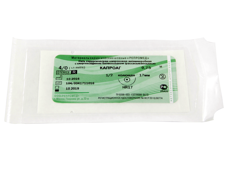 Капроаг (нить хирургическая капроновая антимикробная с хлоргексидином биглюконатом) EP(1,5), USР(4/0), длина 75 см, игла колящая HR17, 1/2 окружность, Россия (ООО "Репромед")
