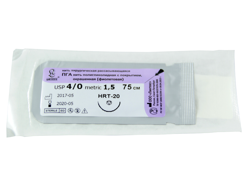 ПГА плетеный фиолетовый МР(1,5), USP(4/0), длина 75 см, игла таперкат HRT-20, 1/2 окружности, Россия (ООО "Линтекс") 11015С200750
