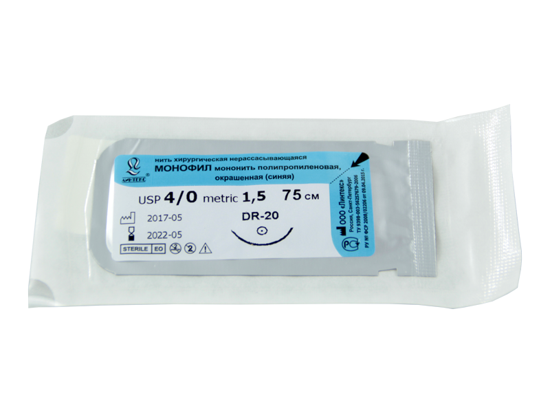 Монофил синий МР(1,5), USP(4/0), длина 75 см, игла колющая DR-20, 3/8 окружности, Россия (ООО "Линтекс") 13215F200750