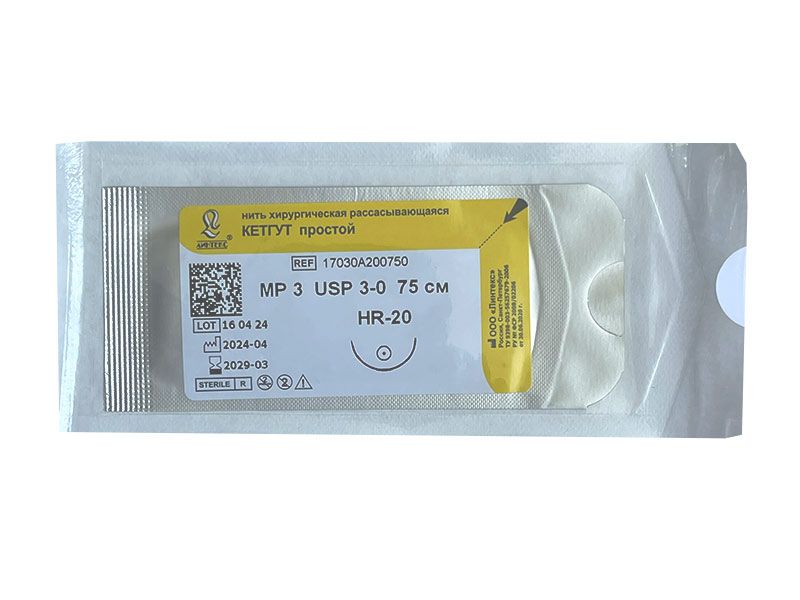 Кетгут простой МР(3), USР(3/0), длина 75 см, игла колющая HR-20, 1/2 окружности, Россия (ООО "Линтекс") 17030А200750