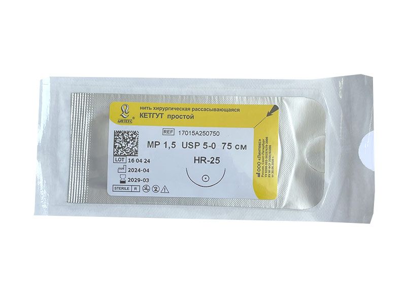 Кетгут простой МР(1,5), USР(5/0), длина 75 см, игла колющая HR-25, 1/2 окружности, Россия (ООО "Линтекс") 17015A250750