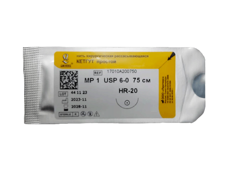 Кетгут простой МР(1), USР(6/0), длина 75 см, игла колющая HR-20, 1/2 окружности, Россия (ООО "Линтекс") 17010A200750