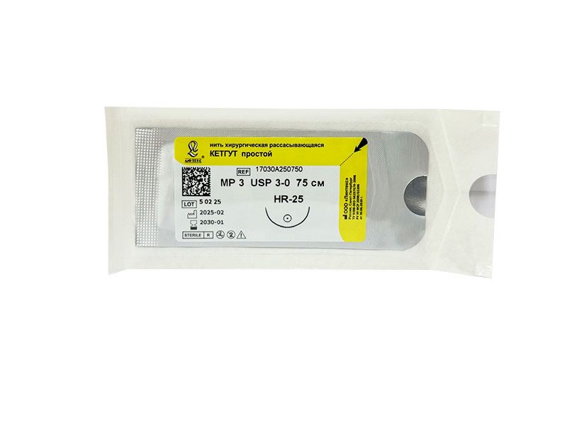 Кетгут простой МР(3), USР(3/0), длина 75 см, игла колющая HR-25, 1/2 окружности, Россия (ООО "Линтекс") 17030A250750