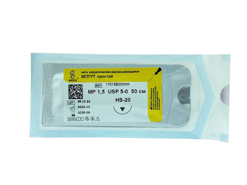 Кетгут простой МР(1,5), USР(5/0), длина 50 см, игла обратно-режущая HS-20, 1/2 окружности, Россия (ООО "Линтекс") 17015В200500