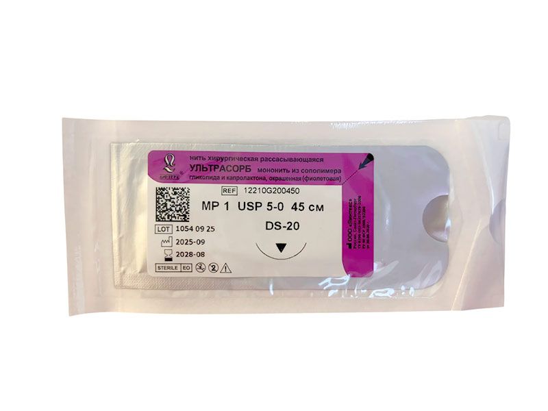 Ультрасорб фиолетовый, МР(1) USP(5/0), длина 45 см, игла обратно-режущая DS-20, 3/8 окружности, Россия (ООО "Линтекс") 12210G200450