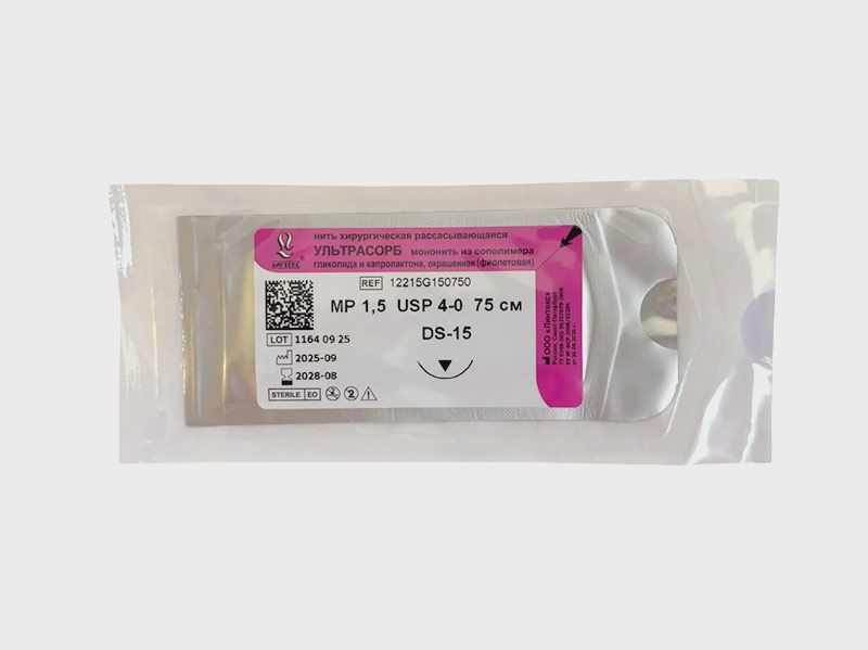Ультрасорб фиолетовый, МР(1,5) USP(4/0), длина 75 см, игла обратно-режущая DS-15, 3/8 окружности, Россия (ООО "Линтекс") 12215G150750