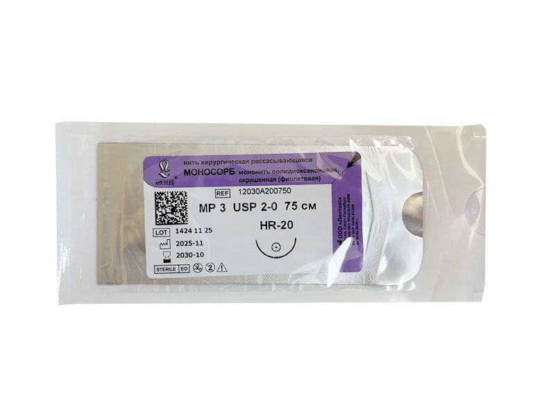 Моносорб фиолетовый, МР(3) USP(2/0), длина 75 см, игла колющая HR-20, 1/2 окружности, Россия (ООО "Линтекс") 12030A200750