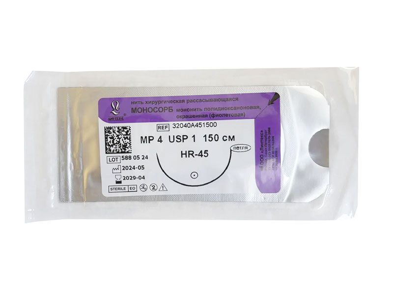 Моносорб фиолетовый, МР(4) USP(1), длина 150 см, игла колющая HR-45, петля, 1/2 окружности, Россия (ООО "Линтекс") 32040A451500