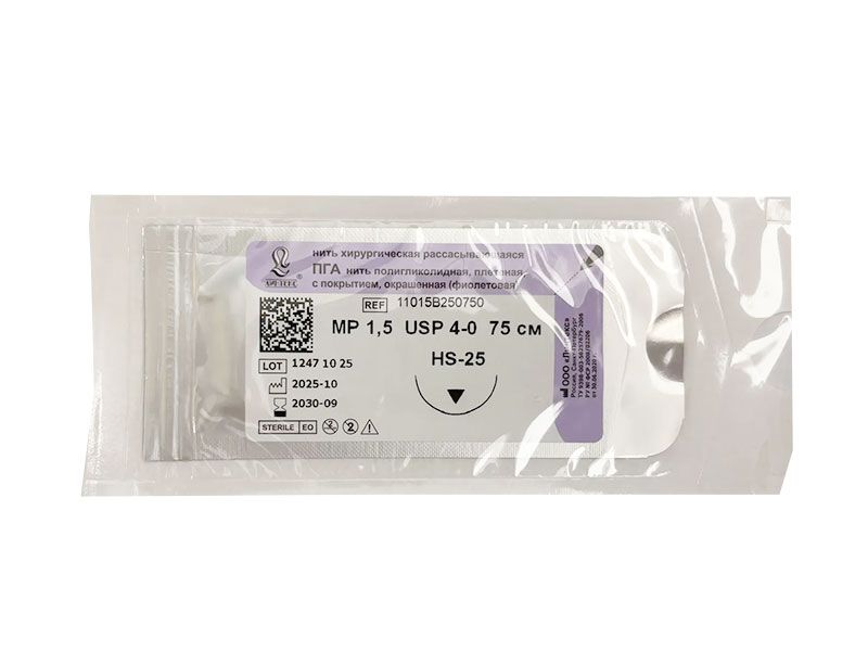 ПГА плетеный фиолетовый МР(1,5), USP(4/0), длина 75 см, игла обратно-режущая HS-25, 1/2 окружности, Россия (ООО "Линтекс") 11015B250750