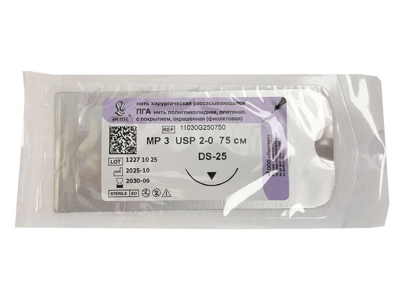 ПГА плетеный фиолетовый МР(3), USP(2/0), длина 75 см, игла обратно-режущая DS-25, 3/8 окружности, Россия (ООО "Линтекс") 11030G250750