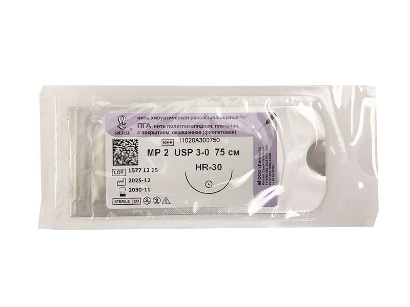 ПГА плетеный фиолетовый МР(2), USP(3/0), длина 75 см, игла колющая HR-30, 1/2 окружности, Россия (ООО "Линтекс") 11020A300750