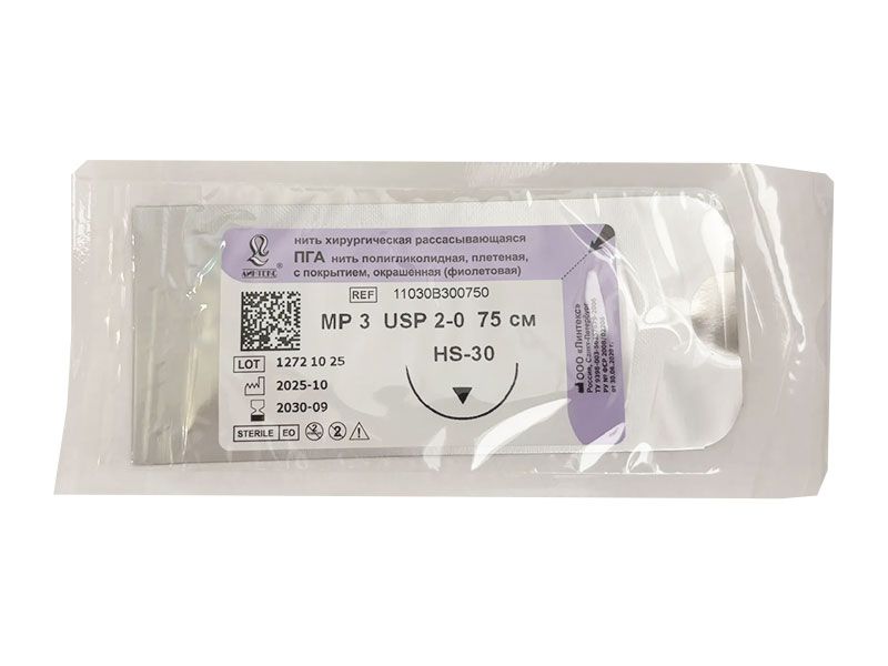 ПГА плетеный фиолетовый МР(3), USP(2/0), длина 75 см, игла обратно-режущая HS-30, 1/2 окружности, Россия (ООО "Линтекс") 11030B300750