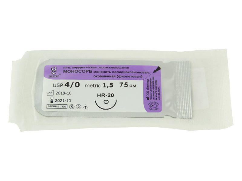 Моносорб фиолетовый, МР(1,5) USP(4/0), длина 75 см, игла обратно-режущая HS-20, 1/2 окружности, Россия (ООО "Линтекс") 12015B200750 МОНОСОРБ - рассасывающиеся мононити из полидиоксанона ... -