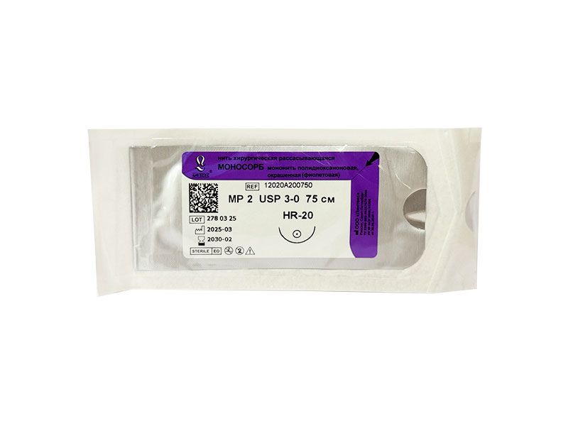Моносорб фиолетовый, МР(2) USP(3/0), длина 75 см, игла колющая HR-20, 1/2 окружности, Россия (ООО "Линтекс") 12020A200750 МОНОСОРБ - рассасывающиеся мононити из полидиоксанона Преим... -