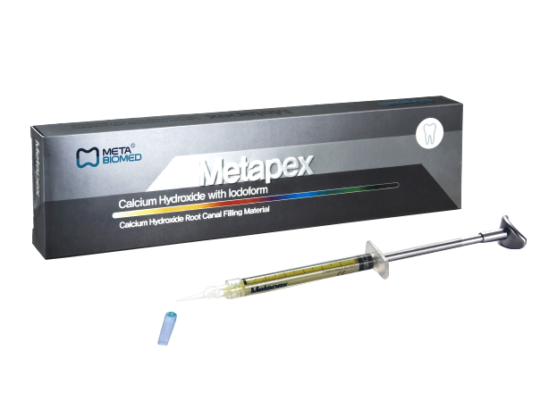- Готовая паста Метапекс, приготовленная на нерастворимой силиконовой основе для постоянного пломбирования каналов, в шприце.