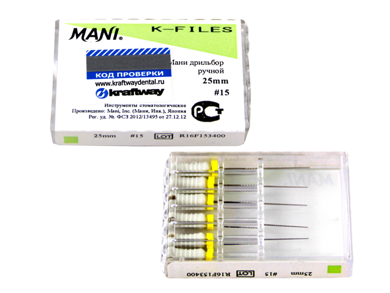Дрильбор ручной Мани (Mani K-Files) №15, длина 25 мм, ISO-15, 6 шт/упаковка, Япония (Mani, Inc.) 0322004М