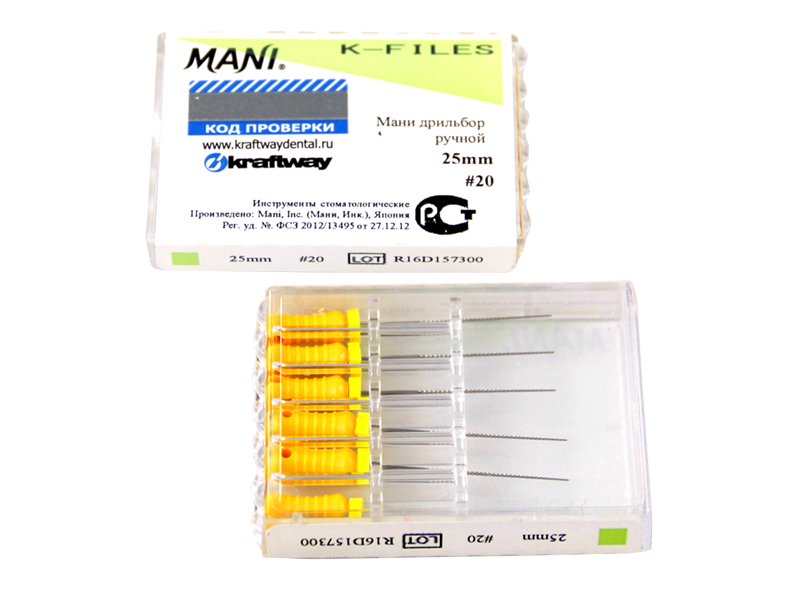 Дрильбор ручной Мани (Mani K-Files) №20, длина 25 мм, ISO-20, 6 шт/упаковка, Япония (Mani, Inc.) 0322005М