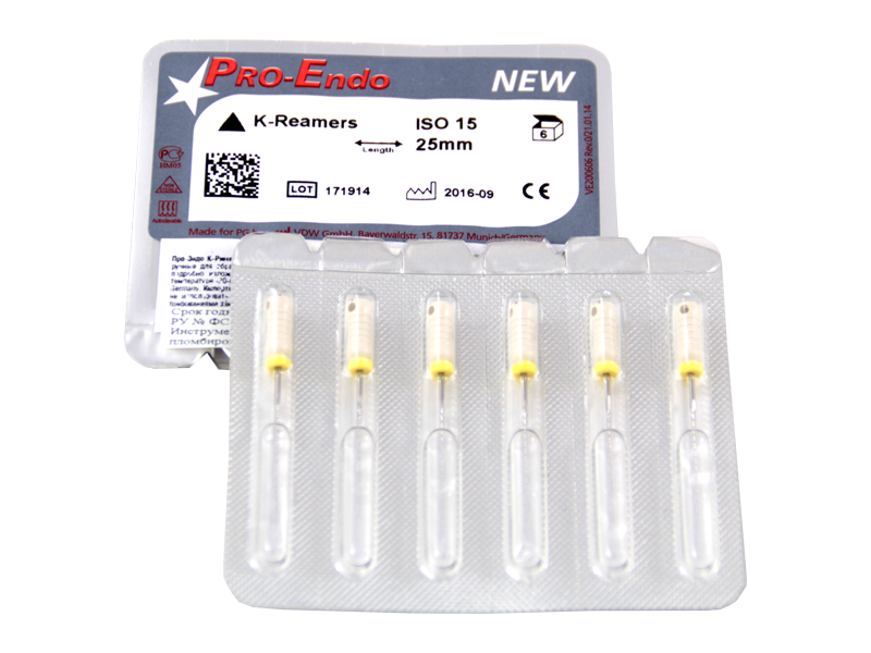 Про-Эндо К-Римеры (Pro-Endo K-Reamers), фасованные (в кассете по 6 шт.), – ручные эндодонтические инструменты, предназначенные для эндодонтического лечения осложненного кариеса:
