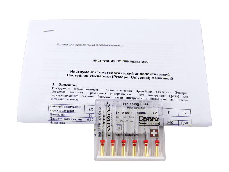 Машинные файлы (протейперы) ProTaper Universal с прогрессирующей конусностью изготовлены из NiTi сплава (никель-титан), что обеспечивает инструменту еще большую гибкость и прочность.
