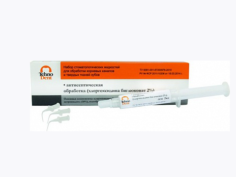 Гель на основе 2% хлоргексидина биглюконата. Комплект стоматологических гелей для облегчения препарирования твердых тканей зуба и антисептической обработки, 5 мл, Россия (ООО "ТехноДент") 024-04-005
