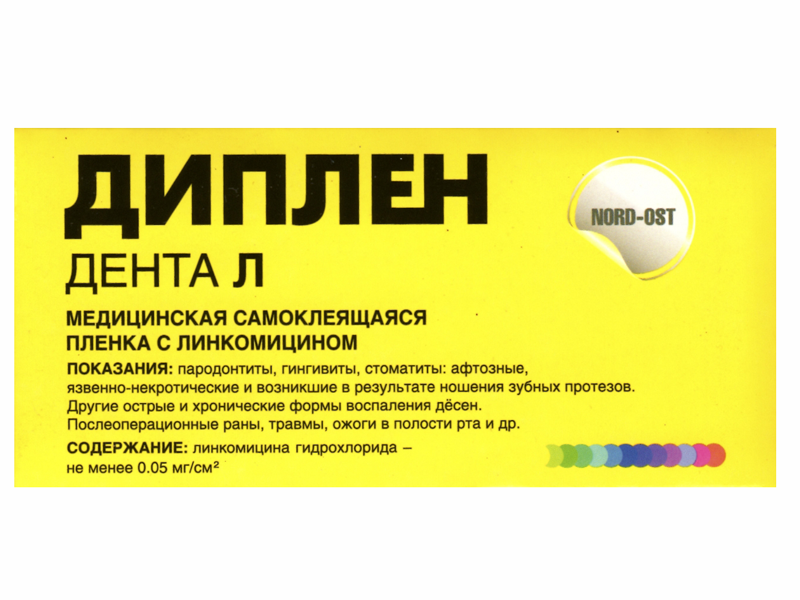 Диплен-дента-Л (линкомицин) - двухслойная полимерная стоматологическая самоклеящаяся пленка, состоящая из совмещенных гидрофильного и гидрофобного слоев.