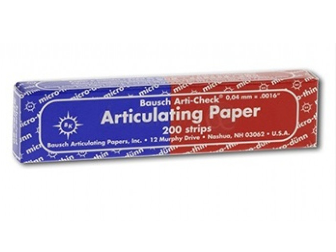 Оклюзионная бумага Бауша микродюн толщиной 40 мкм тонкая и прочная бумага, которая с обеих сторон покрыта жидкой краской. Эта бумага исключает получение ложных или смазанных контактных пунктов и обеспечивает точные, чёткие цветные отпечатки. Несколько большая толщина несущего материала позволяет производить эту бумагу в форме подковообразных полосок. Эта отштампованная бумага без затруднений накладывается на зубную поверхность и не требует применения специальных фиксирующих вилок или пинцетов. Все виды подковообразных полосок поставляются в пластмассовом раздаточном устройстве, из которого вы можете достать бумагу одной рукой. Подковообразные полоски особенно пригодны для пациентов, у которых, из-за патологии височно-нижнечелюстного сустава, при смыкании зубных рядов соприкасаются антагонисты только одной из сторон.