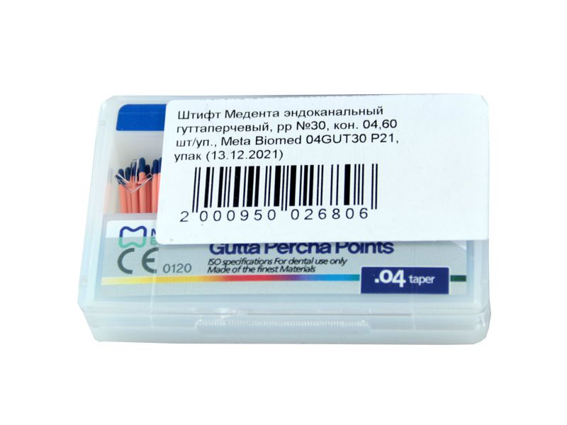 Штифт Медента эндоканальный гуттаперчевый, размер №30, конусность стандартная 04, 60 шт/упаковка, Республика Корея (Meta Biomed Co., Ltd.) 04GUT30 P21