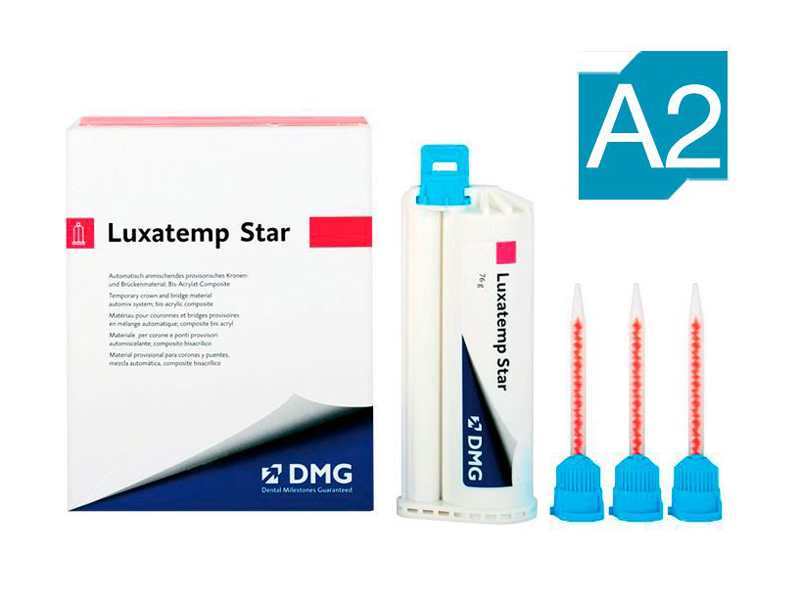 Luxatemp Star оттенок A2 - самополимеризующийся композит для изготовления временных коронок и мостов, вкладок, накладок и виниров. Это двухкомпонентный материал автоматического смешивания на основе мультифункциональных метакрилатов.