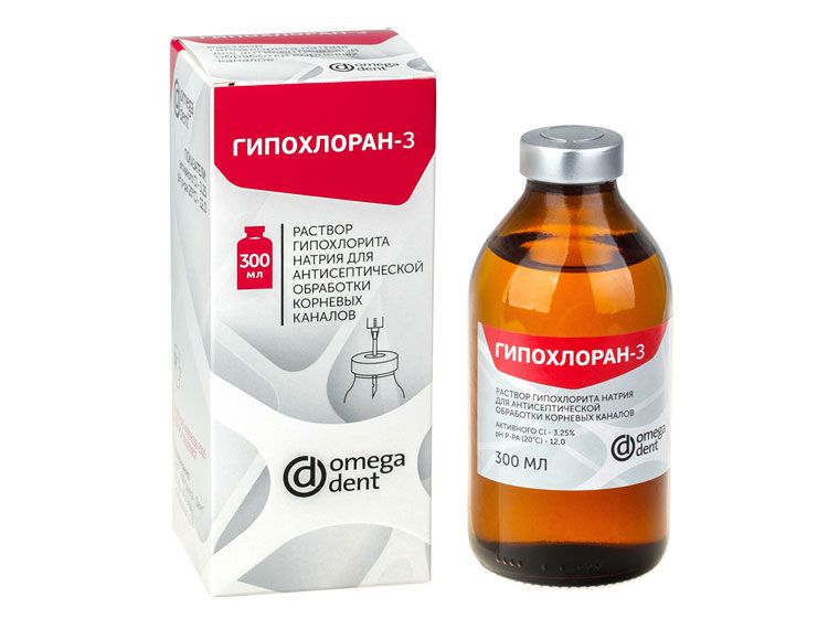Гипохлоран-3. Раствор гипохлорита натрия (3,25%) для антисептической обработки корневых каналов, 300 мл, Россия (ООО "НКФ Омега-Дент")