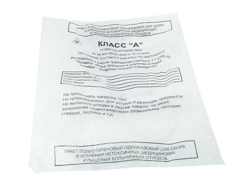 Пакет полиэтиленовый для сбора и хранения медицинских отходов класса А 700*800 "МедКом", 100 штук в упаковке, Россия (НПФ "МедКом")