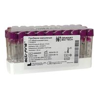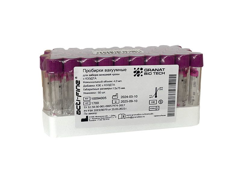 Вакуумная пробирка содержит знак стерильности на пробирке и упаковке, стерилизация радиационным методом.Наличие строго дозированного вакуума, созданного в заводских условиях, для обеспечения строго определённого объёма забираемой крови и стандартно воспроизводимого соотношения кровь/добавка для каждого забираемого образца. Упаковка пробирок – пенопластовый штатив на 100 шт. в термоусадочной плёнке с этикеткой-инструкцией.
