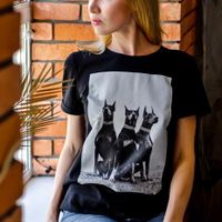 Футболка женская. Выполнена из хлопка с добавлением лайкры, декорирована принтом "Доберманы". Состав: 94% хлопок, 6% лайкра Черный: Размеры: 50,52 Голубой: Размеры: 42,44,46,48,50,52645 ₽