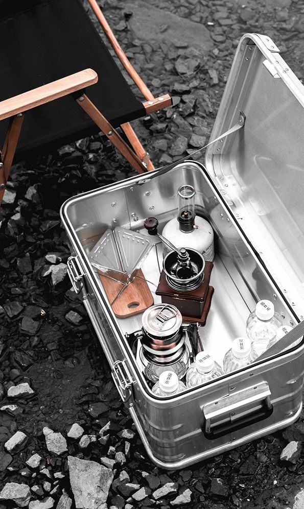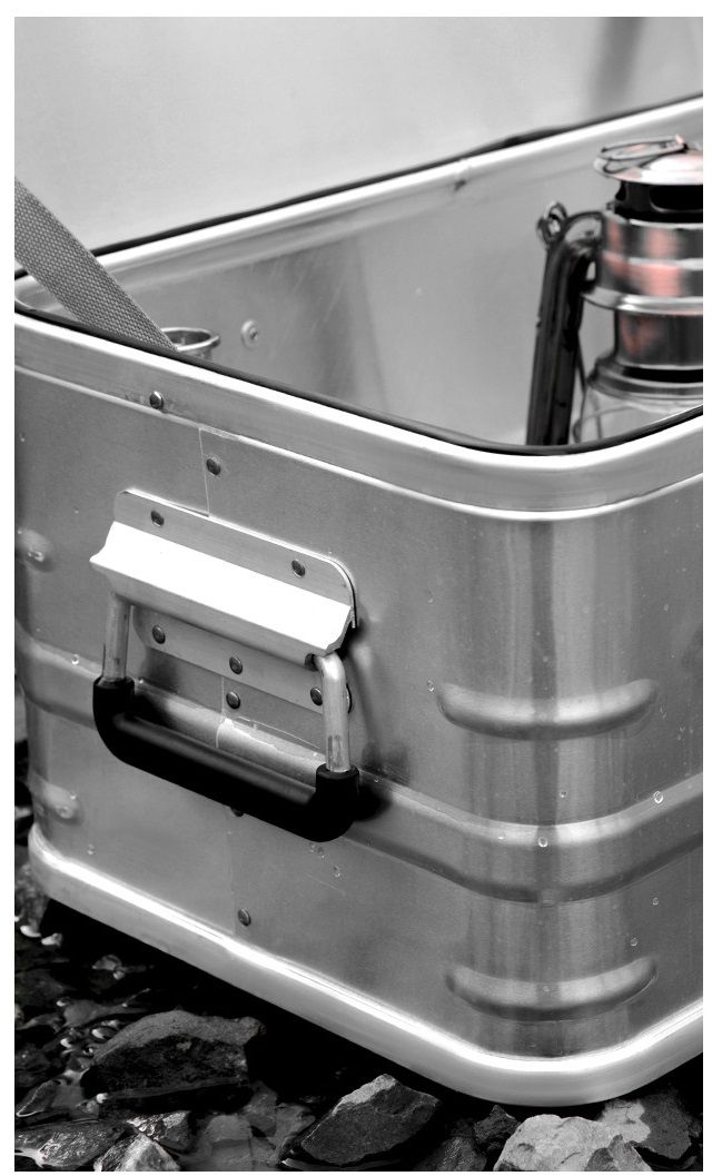 Алюминиевый ящик для кемпингового снаряжения или продуктов. Также послужит мини столиком. Два замка с защелками обеспечивают надёжное закрытие и достаточную плотность прилегания крышки к уплотнительной резинке, металлические ручки для удобной переноски ящика, сверху имеются специальные накладки благодаря которым можно зафиксировать ящик поставленный сверху.