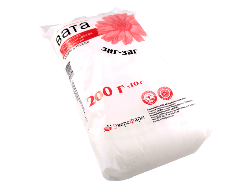 Вата медицинская 200 г "Зиг-Заг" гигроскопическая хирургическая нестерильная, Россия (ЗАО "Фабрика "Ника")