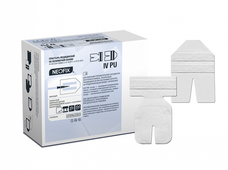 Пластырь медицинский "Neofix IV PU" 5*5,7 см на полимерной основе (для фиксации периферических сосудистых катетеров и канюль), 100 штук в упаковке, Египет (Pharmaplast S.A.E.) Для фиксации периферических сосудистых катетеров и канюль