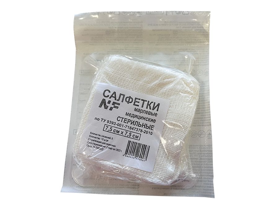Салфетка 7,5*7,5 см марлевая медицинская, стерильная, 8 сложений, плотность 32 грамма, 10 штук/упаковка, Россия (ООО "Ньюфарм")