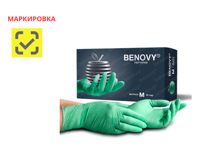 Перчатки Benovy смотровые нитриловые неопудренные нестерильные (текстурированные), зеленые, размер M, 50 пар/упаковка, Малайзия (TG Medical Sdn.Bhd.) M205K3